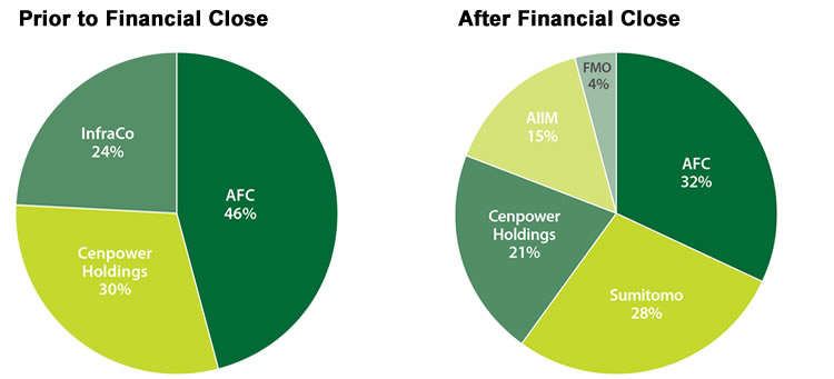 Through equity injection, three leading investment groups joined the project in 2014, whilst InfraCo, a project co-developer since inception, exited the project. The new investors were Sumitomo Corporation of Japan, African Infrastructure Investment Fund II and its co-investors (via an investment vehicle called Mercury Power) and FMO. The project founders (through their vehicle, Cenpower Holdings) and AFC, remained as project Sponsors.